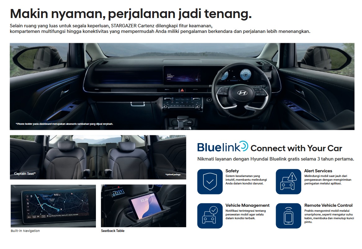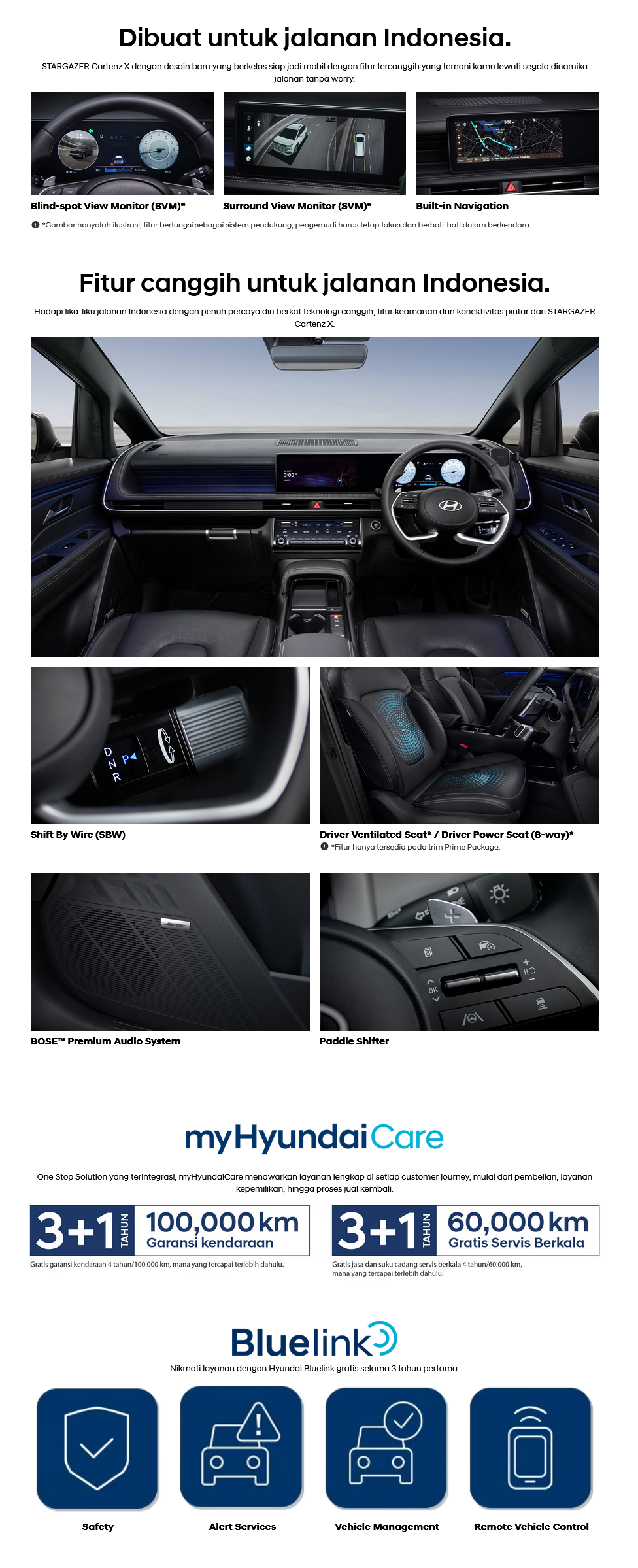 tampil sebagai MPV crossover premium yang menggabungkan desain gagah dengan fitur canggih. Dengan dimensi lebih besar dan ground clearance lebih tinggi dibanding versi Cartenz biasa, varian X menawarkan kenyamanan ekstra lewat jok kulit berpendingin, kursi elektrik 8 arah, sistem audio BOSE, dan transmisi Shift-by-Wire. Ditenagai mesin Smartstream 1.5L MPI dan transmisi iVT, mobil ini juga dilengkapi Hyundai SmartSense yang mencakup kamera 360°, Blind-spot View Monitor, dan Smart Cruise Control. Cocok untuk pengguna yang menginginkan pengalaman berkendara modern dan aman di jalanan Indonesia.
